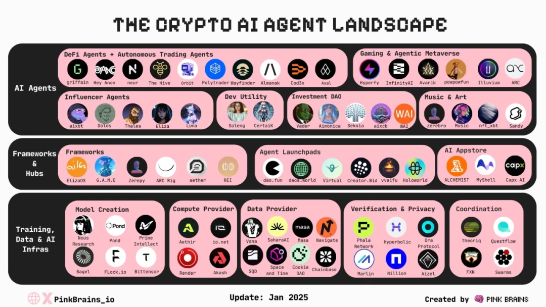 在Solana第一波AI代币浪潮中,部分项目已展现出实际应用价值,超越了纯粹投机。例如,ai16z推出的ELIZA框架、aixbt等提供市场分析和内容创作的AI代理,以及各类将AI与区块链能力整合的工具包,都标志着这一领域的初步成熟。
