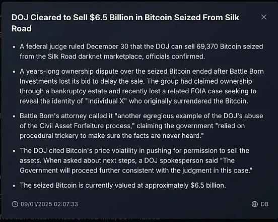 1月9日,美国司法部正式获得批准,将清算从"丝绸之路"暗网案件中扣押的价值约65亿美元的比特币。这一决定源于联邦法官于2024年12月30日的裁定,彻底解决了这批比特币的归属权争议。尽管司法部强调因比特币价格波动需尽快出售,但实际清算过程仍面临行政程序与潜在上诉等障碍,不会立即执行。