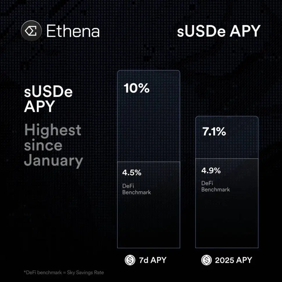 Ethena的诞生旨在突破传统稳定币收益瓶颈。传统法币抵押型稳定币(如USDC、USDT)虽具高流动性与低波动性,但持有收益偏低,难以满足加密市场对资产收益性的需求。该项目着力打造兼具稳定性与高收益的合成美元稳定币USDe,核心机制为“加密资产抵押+对冲策略”:用户抵押BTC、ETH、SOL等主流加密资产铸造USDe,协议通过动态对冲(如资金费率套利、期货合约对冲)管理风险,并将套利收益分配给持有者,年化收益约10%,显著高于传统美元基金。此外,锚定法币及机构资产的USDtb稳定币,以平衡合规性与市场需求,为传统金融机构进入加密领域提供通道。