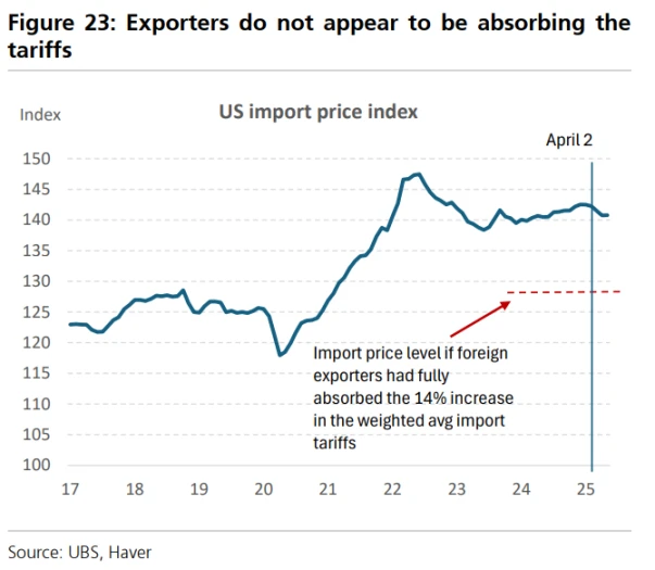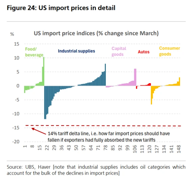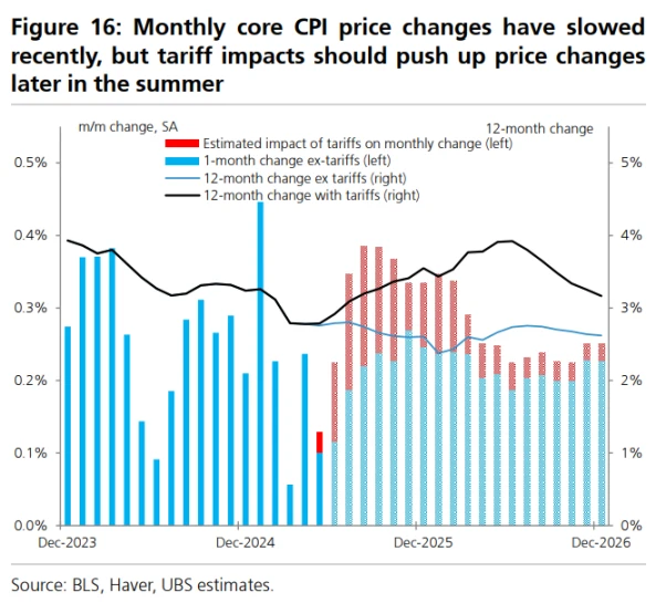 尽管美国大规模关税理论上已推升个人消费支出(PCE)价格1.1%,但官方CPI和PCE数据尚未明显反映这一影响。瑞银指出,滞后效应源于多重因素:装船日期豁免政策、企业库存缓冲、中间品与资本品价格传导时滞,以及CPI双月抽样方法。