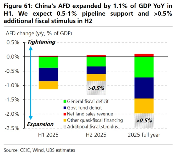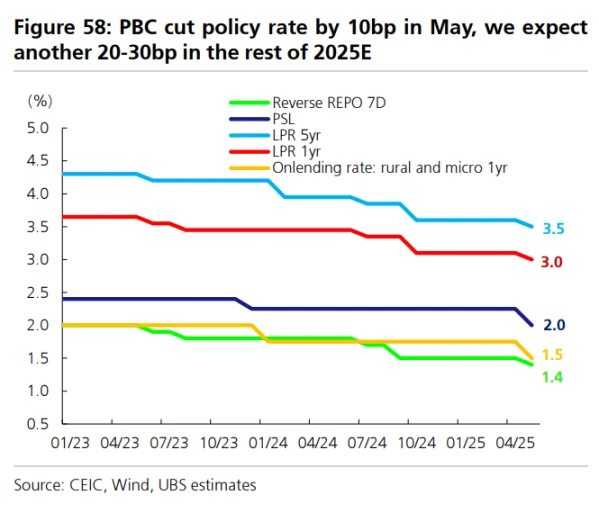 中国在“5%左右”GDP增长目标下,推出适度政策刺激组合。广义财政赤字扩大至占GDP 1.5%-2%,货币政策保持“适度宽松”基调,预计政策利率将下调30-40个基点。实施层面,央行5月已下调政策利率10个基点、降准50个基点,并推出新再贷款工具支持消费与创新。上半年政府债券净发行强劲,推动6月信贷增长同比达8.8%。瑞银预计,下半年将落实剩余计划财政刺激(占GDP 0.5%-1%),可能在三季度末推出超0.5%GDP的额外刺激措施,同时伴随20-30个基点利率下调,以巩固经济增长动能。