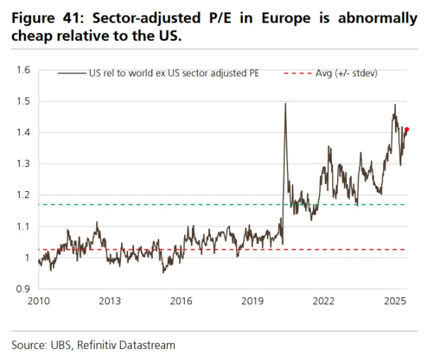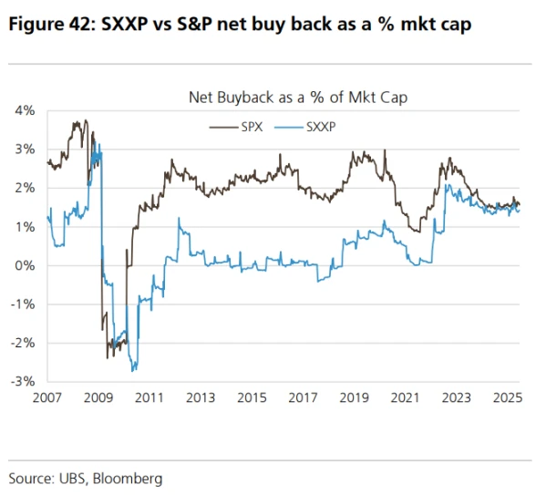 财政与家庭储蓄层面,欧洲超额储蓄约占GDP 10%,美国仅2%,凸显欧洲经济韧性。瑞银指出,美国相对欧元区的“例外主义”正在弱化,预计2026年其GDP增长将略低于欧盟,回购规模占市值百分比已趋同。基于此,该行维持基准配置美股、超配欧股的策略建议。