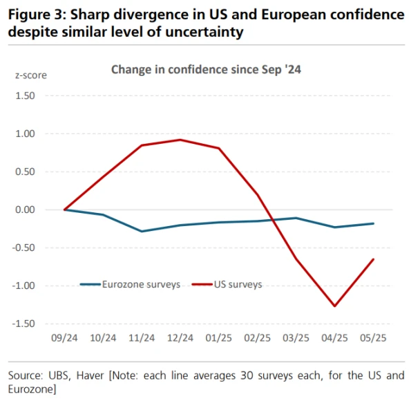 美国信心指数下跌幅度远超其他地区,尽管欧美面临相似政策不确定性,但其调查数据已较12月水平低1.5个标准差,国内市场情绪尤为脆弱。