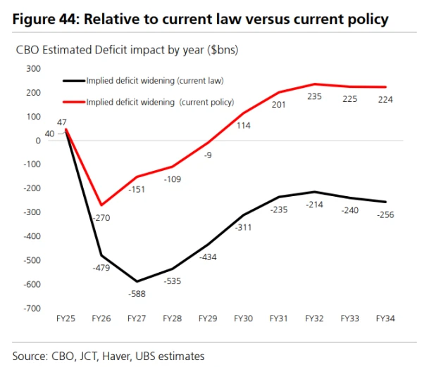 针对“大漂亮法案”,瑞银分析显示,该法案在2026年前将扩大财政赤字,之后逐步收窄,10年内总计减少赤字4000亿美元。短期内,通过扩大2017年税改商业条款(如完全费用化、研发税收抵免等),预计2026年前为经济增长贡献约45个基点;