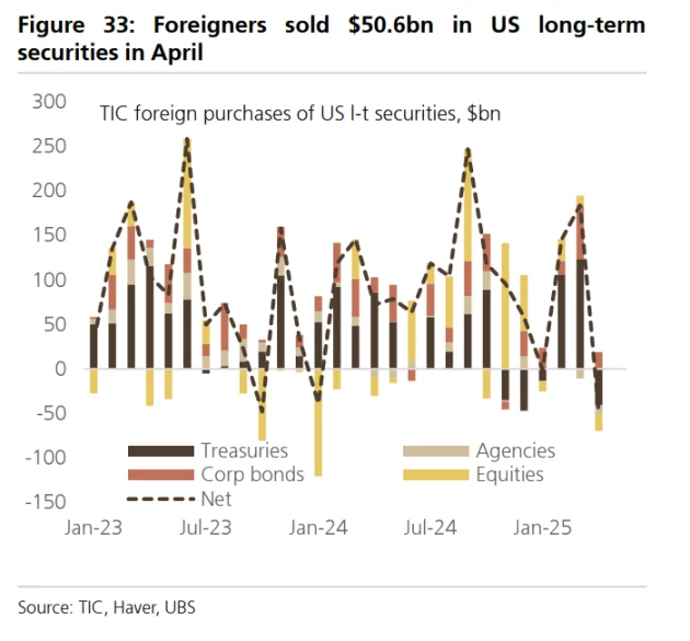 外国投资者减少美国资产敞口的趋势引发关注。4月美国国际资本流动报告(TIC)显示,外国投资者净卖出506亿美元美国长期证券,包括188亿美元股票和408亿美元国债,初步印证资金流出迹象。