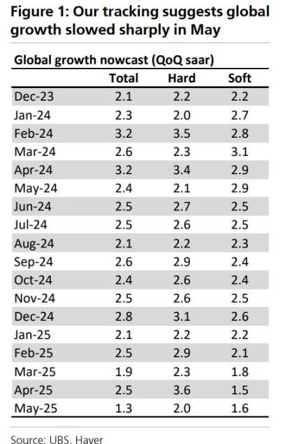 关税对经济数据的影响呈现阶段性分化。4月关税公告发布后,全球硬数据(如实际经济产出)年化增长3.6%,软数据(如市场信心指数)仅1.3%,两者差距达27年峰值。进入5月,硬数据恶化速度快于软数据改善,两类数据开始趋同。瑞银全球增长跟踪综合数据显示,全球经济年化增长率仅1.3%,处于历史第8个百分位的极低水平,增长动能显著弱化。