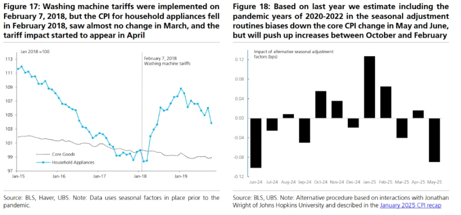 该行预计,关税对通胀指标的显著影响将延迟至7月CPI数据(8月发布)中体现。参考2018-2019年特朗普时期洗衣机关税经验,关税实施后需2-3个月才在CPI中明确显现,10%通用关税预计将产生类似时滞。