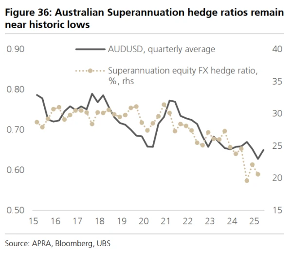 瑞银认为,美元持续贬值可能与全球投资者提高美国资产外汇对冲比率相关,例如澳大利亚与加拿大养老基金对冲比率仍处历史低位,存在进一步上升空间。