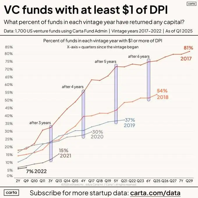 2025年加密VC市场承压明显,上游DPI指数波动与LP资金流动性收紧形成连锁反应,基金返现效率走低直接压缩可投规模,创始人融资难度陡增。但市场韧性亦不容忽视:尽管交易数量放缓,资本部署节奏与2024年基本持平。这种分化背后,既有部分基金临近存续期尾声的被动收缩,也有头部机构持续加注大额交易的主动布局。