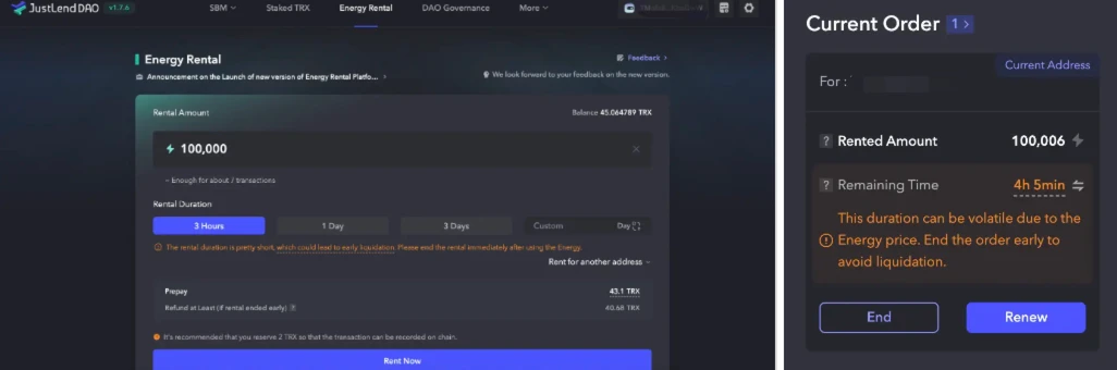 授权确认:点击“Rent Now”,钱包授权后能量即时到账,可在钱包或协议页面查看余额;