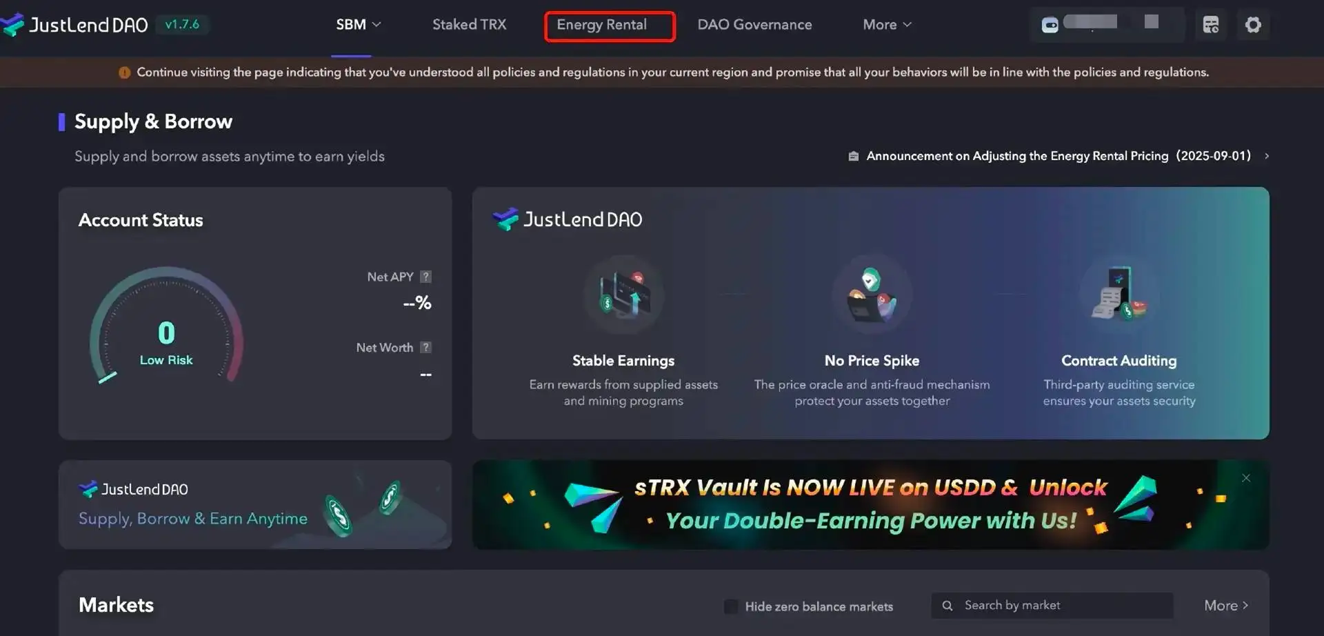 进入功能页面:在JustLend DAO官网导航栏选择“Energy Rental”模块;