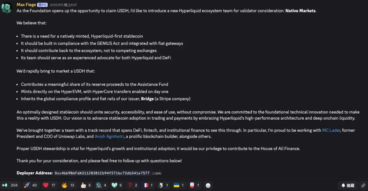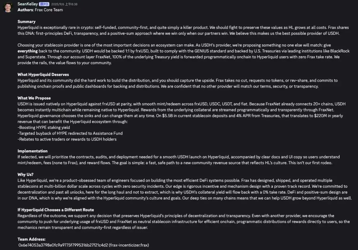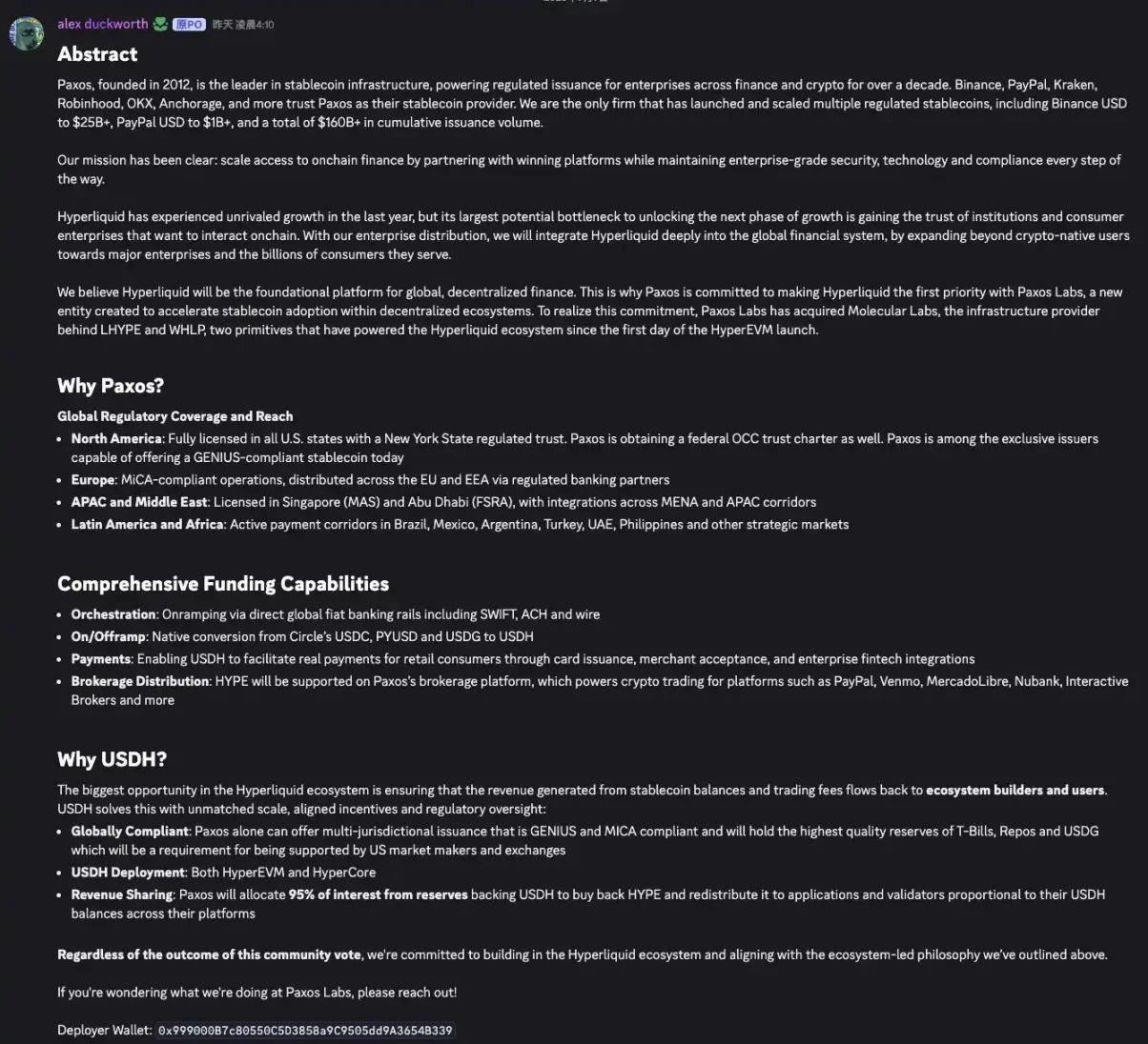 早期Hyperliquid团队曾计划自行发行USDH并预留代币符号,但在社区对中心化治理的质疑下,转而通过公开竞标与社区投票确定发行方。官方放弃独占发行收益,以“Hyperliquid优先、生态对齐”为导向选择合作伙伴,吸引了Paxos、Frax、Agora等参与。