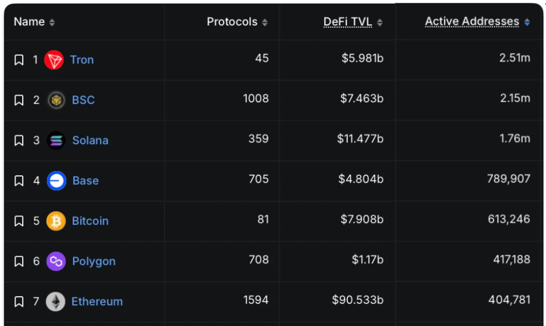 TRON生态为USDD成长提供坚实基础。据Defillama数据,TRON以每日250万活跃地址数位居区块链网络前列,DeFi总锁仓价值亦名列前茅,且USDT在TRON链上流通量领先各大公链。庞大用户基数与成熟DeFi基础设施,为USDD早期测试、用户获取与流动性积累提供肥沃“土壤”,使其跨链拓展前已具备较强生态根基。