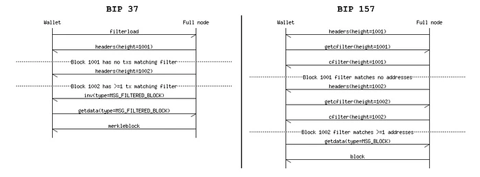 根据BIP和中的规定,客户端首先从多个对等体中下载头部和创建日期之后的所有块的过滤器。使用类似于区块头自身的链式承诺,BIP 157允许客户端高效检查所有对等体之间对过滤头部的共识,并禁止任何试图提供无效过滤器的对等体。这意味着拥有至少一个诚实对等体提供块过滤器的客户端将有保证地看到所有与其相关的事务。已经有初步实现这种客户端的项目,名为,由Lightning Labs创建。