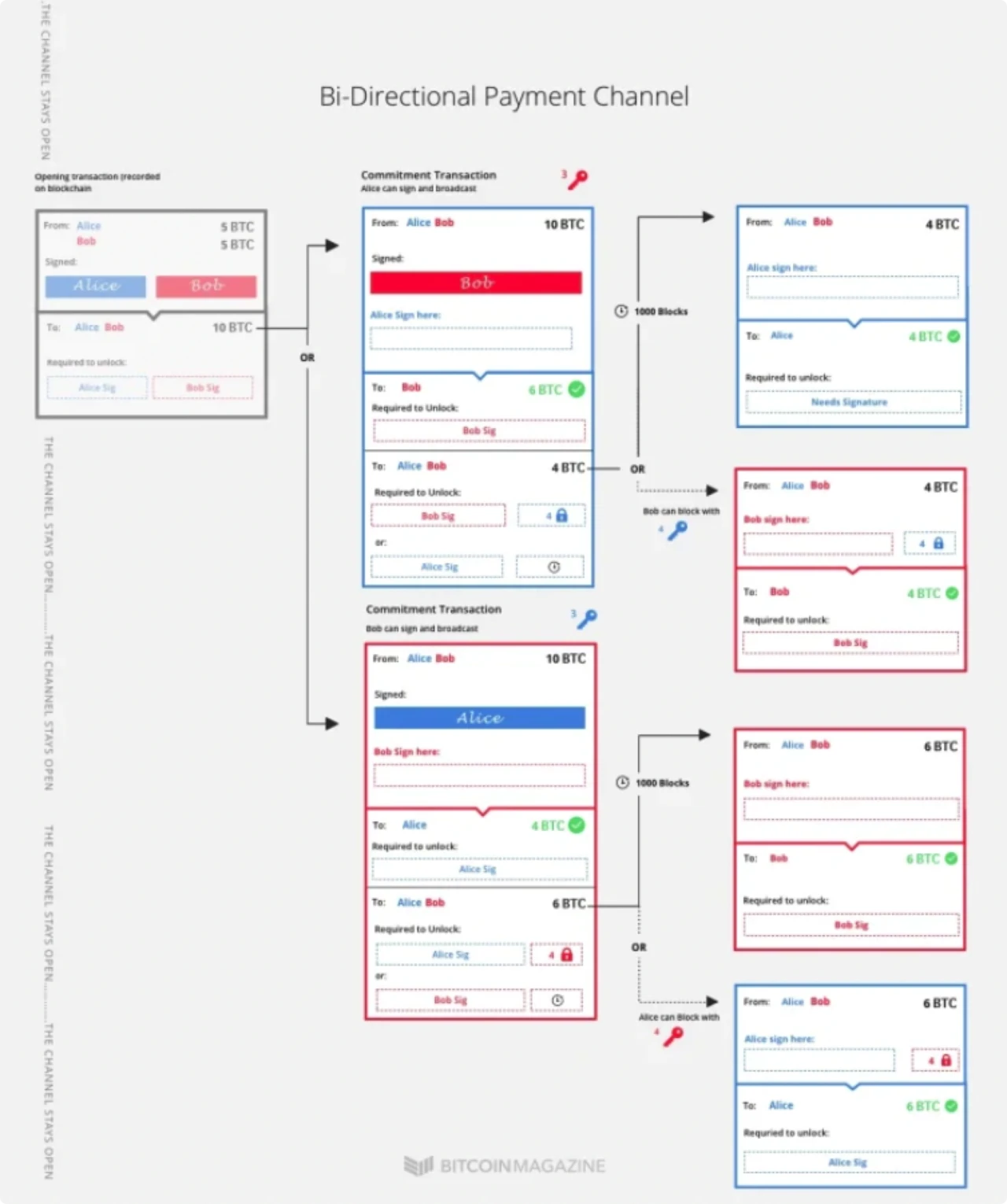 具体来说,这意味着如果 Alice 想要关闭通道,她可以创建一个事务向自己支付 4btc,同时向 Bob 支付 6btc,然后让 Bob 签署并广播该事务。Bob 没有理由不答应这个请求,他大概率会配合 Alice 关闭该通道。