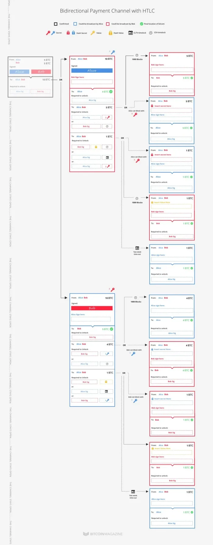 第三种方法是,与其它哈希时间锁合约一样,这两个承诺事务也包含常见的 CLTV 时间锁(绝对时间锁)超时退回机制,即,如果 Bob 没有在限期(比如两周)内将秘密值包含在后序事务内,Alice 就可以取回自己的 1btc。在这种情况下,终止通道的人是 Alice 还是 Bob 都没关系。