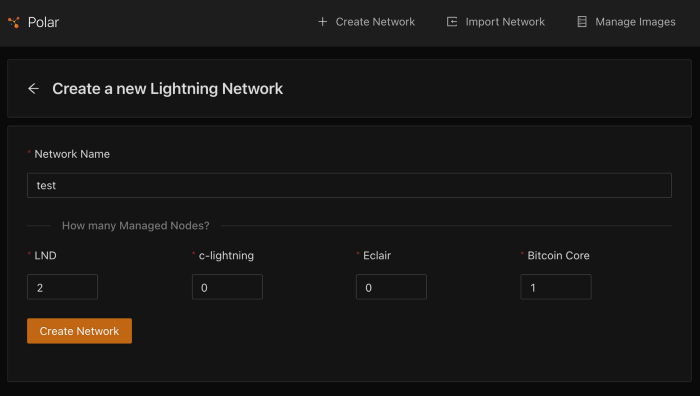 点击 "Create Network(创建网络)",即可在 Polar 中轻松创建模拟闪电网络环境。你可以随意命名这个网络(我个人认为 "test(测试)" 是个聪明的选择)并添加两个 lnd 节点和一个 Bitcoin Core 节点。实际上,对于刚入门的人来说,这些只是最低配,之后还可以添加更多节点。你创建好网络后就可以启动它。首次启动网络时需要的时间可能会长一些,因为你必须下载所有 Docker 镜像。顺带一提,你需要在自己的设备上运行 Docker。就像我之前说的,这里还是得靠自己摸索。
