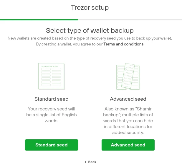 当你首次设置你的 Trezor Model T 时,Trezor Suite 的引导流程会问你想要创建标准助记词(由 12/24 个单词组成的单词表)还是高级助记词(由 20 个单词组成的单词表,可以创建多个份额)。高级助记词背后的 是 SatoshiLabs 在 2017 年创建的公开标准,使用了著名密码学家 Adi Shamir 提出的密码学方法来安全地创建份额并因此得名。