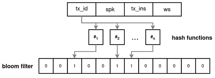 轻客户端无法将其地址/script_pubkeys共享给完整节点。 好吧,他们可以,但不应该这样做,因为这样做会损失隐私。 他们可以做的是创建他们可能感兴趣的交易的超集。 这是使用布隆过滤器(bloom filters)完成的——一种概率搜索过滤器。 这些过滤器是大小为 n 的位字段,通过将事务传递到一组哈希函数来创建,记录每个哈希函数的输出数 q (介于 1 和 n 之间),并将位置 q 处的位拨为开 (0 到 1)。