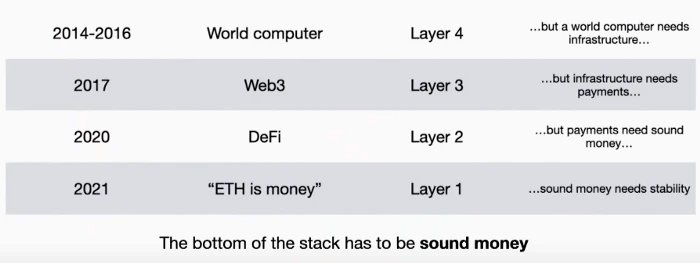 比特币上也有这些概念,但次序弄对了。比特币区块链作为基础层,已经为安全性和稀缺性(健全货币)尽可能优化了。然后所有东西都可以在此基础上建立。所有其它项目都不关心底层的基础设施。只有比特币尽可能优化了其基础设施。所以只有比特币网络,就像只有一个互联网一样。也许你可以看到某个山寨币只是一个可以添加到世界上最安全的网络(比特币区块链)上的一个新功能。而这种分层的方法让比特币变得极为宝贵、并为之带来全新用途。比特币可以做其它项目希望做的事,只不过做得更好、更可扩展和健壮。