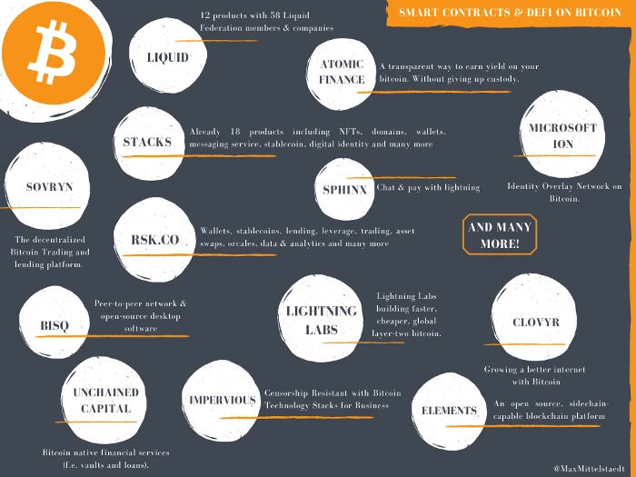 你在比特币底层上使用多签名脚本(它本身已经是一种智能合约)锁定一些比特币。锁定之后,你就能在其他层上发行一些新 “币”(它其实还是比特币或者说聪),然后你就可以做任何你想做的事。比特币就像一个黑洞,可以把所有重要的金融服务都吸进去。