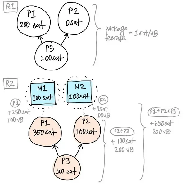 在 R2 中,交易包手续费率足以替代 M1 和 M2,但 P1 支付了部分手续费。矿工挖掘 P1+M2 跟挖掘 P1+P2 所得的手续费是相同的。挖掘 P1+P2+P3 可以额外得到 100 聪,但需要路由额外的 200vB 体积的交易 —— 它们没有为自己的带宽付费。通过先接受 P1,然后再以交易包的形式验证 P2+P3,我们很容易贯彻交易包的规则。