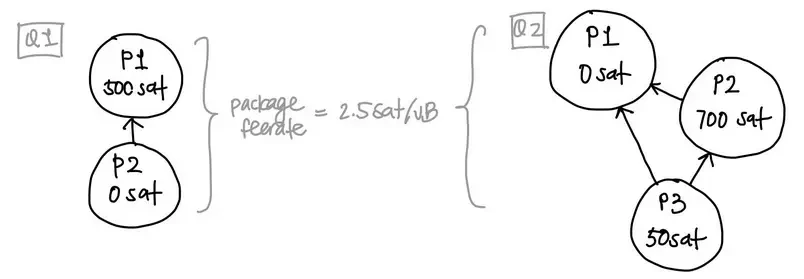 案例 Q1 和 Q2 展示了交易包手续费率的粗心应用可能导致 "父为子偿" 的行为。假设所有交易都是 100 vB;两个的交易包手续费率都是 2.5 聪/vB,但子交易的贡献都非常小。在 Q1 中,只接受 P1 就可以获得所有的手续费,而不必再接受 P2 的额外 100 vB,所以 P2 应被拒绝。而在 Q2 中,P3 贡献了 50 聪,但体积是 100 vB,所以它也应该被拒绝。注意 Q2 的一个临界情形:单独提交每一笔交易并无帮助,因为 P1 的手续费是 0 聪,而 P2 依赖于 P1。幸好,P1 + P2 也是一个有效的交易包,因此可以得到广播。
