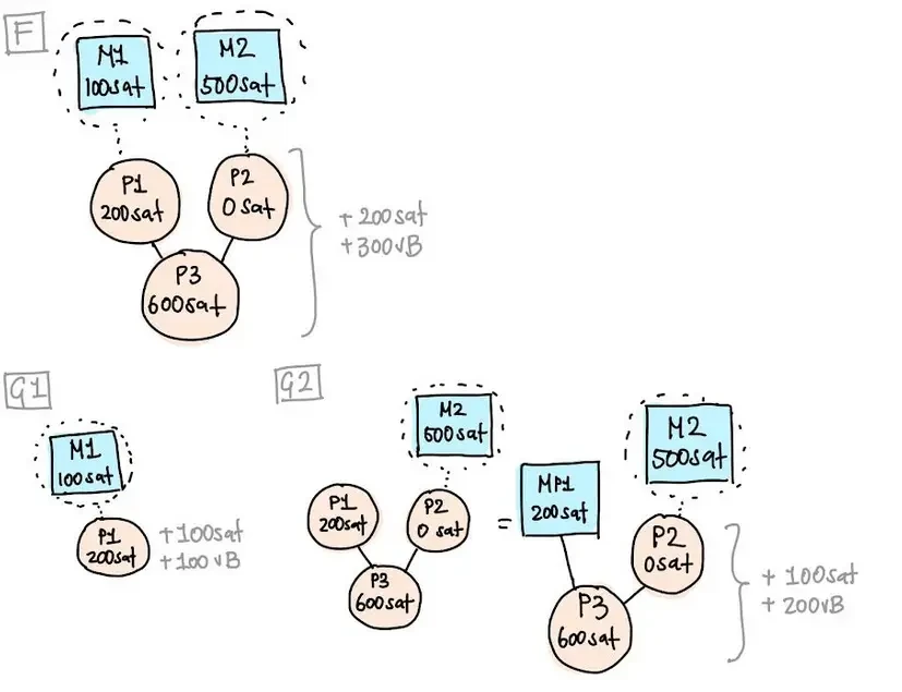 下图的案例 F 和 G 实际上相同的交易包;但在 G 中,P1 在交易包广播之前就已经提交了。在案例 F 中,我们可以看到,300vB 的交易包额外支付了 200 从的手续费,这不足以支付自身的带宽(根据 BIP125#4 规则)。而在案例 G 中,可以看到 P1 支付了足够多的手续费来取代 M1,但如果在交易包提交时再次使用 P1 的手续费,则看起来就像一个 200 vB 的交易包额外支付了 300 聪手续费。尽管在案例 F 中,考虑其手续费和体积的结果就是手续费是不够的,但 300 聪看起来足以为 300 vB 的交易包支付手续费。在消除复制之后,可以得出这个 200 vB 的交易包只额外支付了 100 聪的手续费,所以根据 BIP125#4 ,它会正确地传出失败。假设所有交易的体积都是 100 vB。