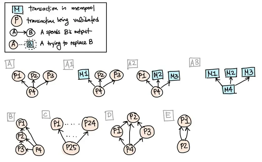 - 手续费追加(fee bumping):用户/钱包 的动作,利用矿工的激励加速一笔交易进入区块的优先级,包括 "子为父偿(CPFP)" 和 " 手续费替换"。在交易池规则中,我们的目标是,判断出一笔新进入的交易是否比池内原来的交易更加经济,但不会开启 DoS 界面,所以也需要一些限制。