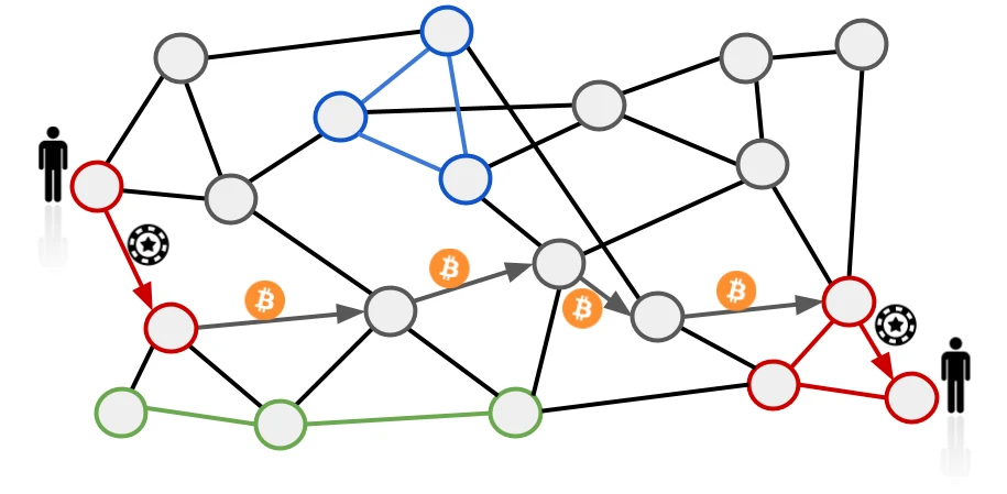- 带有 RGB 染色通道的闪电网络图示。灰色的圆形代表普通的闪电网络节点,而染色的圆形代表支持某种 RGB 资产的节点。在资产通过一条闪电网络路径转移时,一些既有普通比特币通道、又有染色通道的节点将作为交易所,使得支付能利用比特币流动性来送达目的地。 -