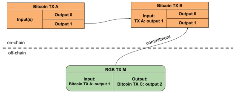 那么它到底怎么工作呢?在 RGB 中,基本上代币都归属于一个比特币 UTXO(无论是已经存在的 UTXO,还是临时创建的),而为了转移代币,你需要花费这个 UTXO。在花费这个 UTXO 的时候,比特币交易必须包含对一条消息的承诺,这条消息的内容是 RGB 的支付信息,它定义了输入、这些代币将被发送到哪个 UTXO、资产的 id、数量、花费的交易以及其它需要附加的数据。