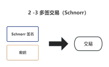 而在 Schnorr Signature 场景中,链上交易只需要一个聚合的公钥和一个签名即可,降低了很多的交易字节数,也就是降低了转账成本。