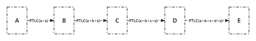 虽然可以采用「简单」的方法,即在整条路径中使用相同的秘密值 s,就像我们使用 HTLC 时所做的那样,但实际上这并非唯一的解决方案。事实上,秘密值 s 和 s’ 不必相同。关键在于,只要一个节点知道了 s’,那么它就能够知道 s,因此我们可以构建秘密值时满足这个条件。这就是 PTLC(Pointlocked Timelocked Contract)的核心概念, 下述为图示案例:
