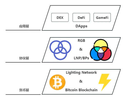 在比特币网络中,Schnorr 签名和 Taproot 等提案的逐步实施,以及以 LNP/BP 和 RGB 为核心的二层协议的不断成熟,为我们描绘出了一个令人兴奋的未来。在这个背景下,标准 Web3 的发展路径愈发清晰,构筑了一个建立在更为复杂的去中心化技术和密码学基础之上的全新格局。Infinitas 技术团队认为这种格局将以 LNP/BP 协议为基石,呈现出分层结构,类似于 TCP/IP 的架构,将货币层、协议层和应用层三个关键层次有机地融合在一起。