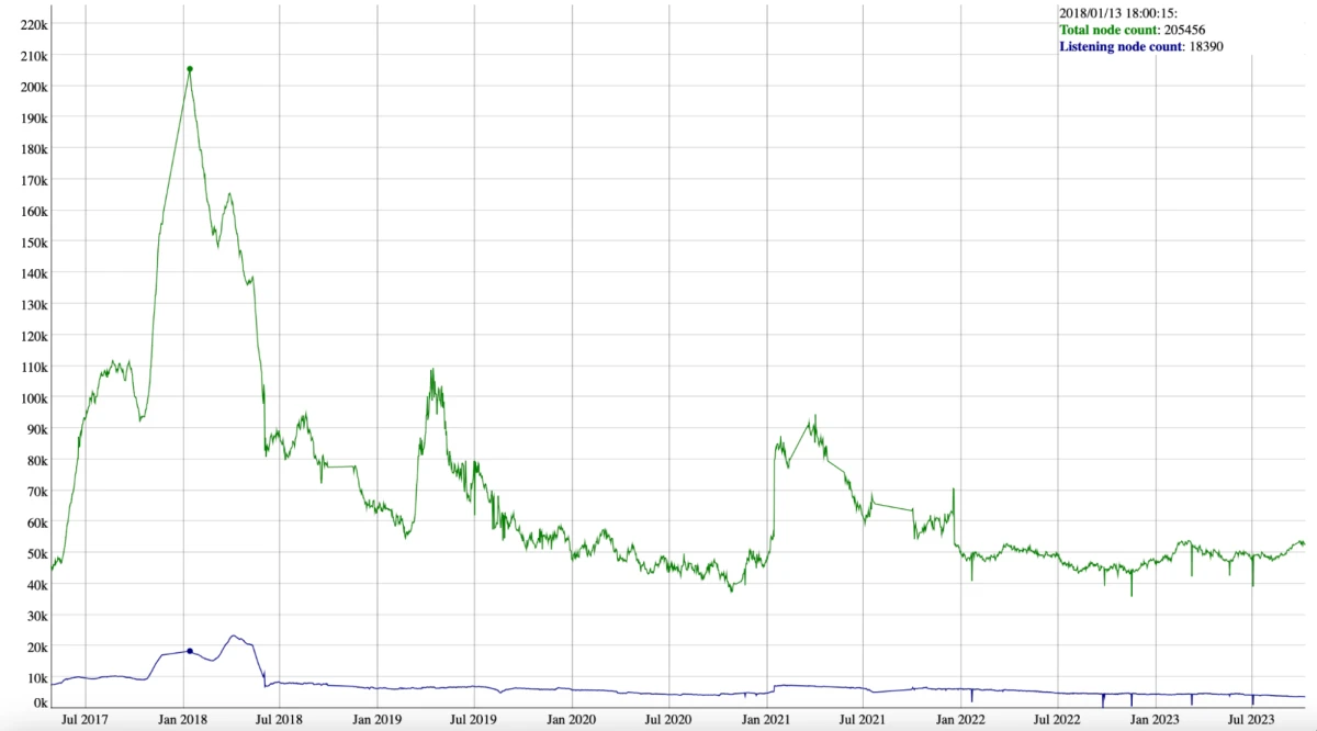 还值得注意的是这个数字的历史维度。根据 ,可以看到现在的数量远远低于峰值。在 2018 年 1 月 13 日,统计值曾到达 20 5000 个。这跟比特币的汇率在那个时间点的几周前达到峰值高度相关。在 2021 年,我们也可以观察到节点数量的统计值在比特币汇率上升时上升,但只达到了接近 9 0000 的数值。